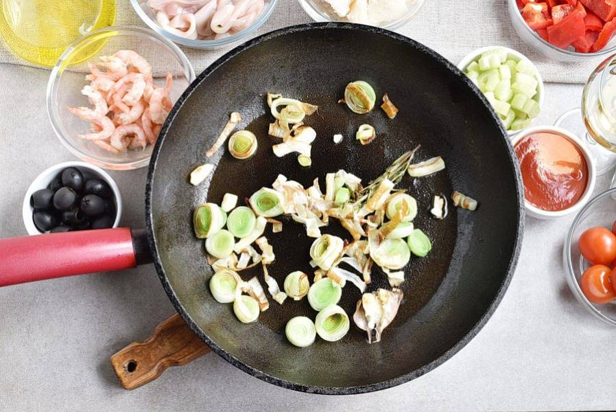 Выложите лук-порей, нарезанный кружочками. Жарьте пару минут, помешивая.