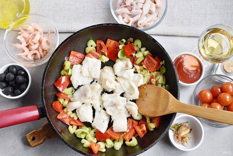 Удалите чеснок и розмарин. Выложите кубики рыбного филе и жарьте 3 минуты, помешивая.