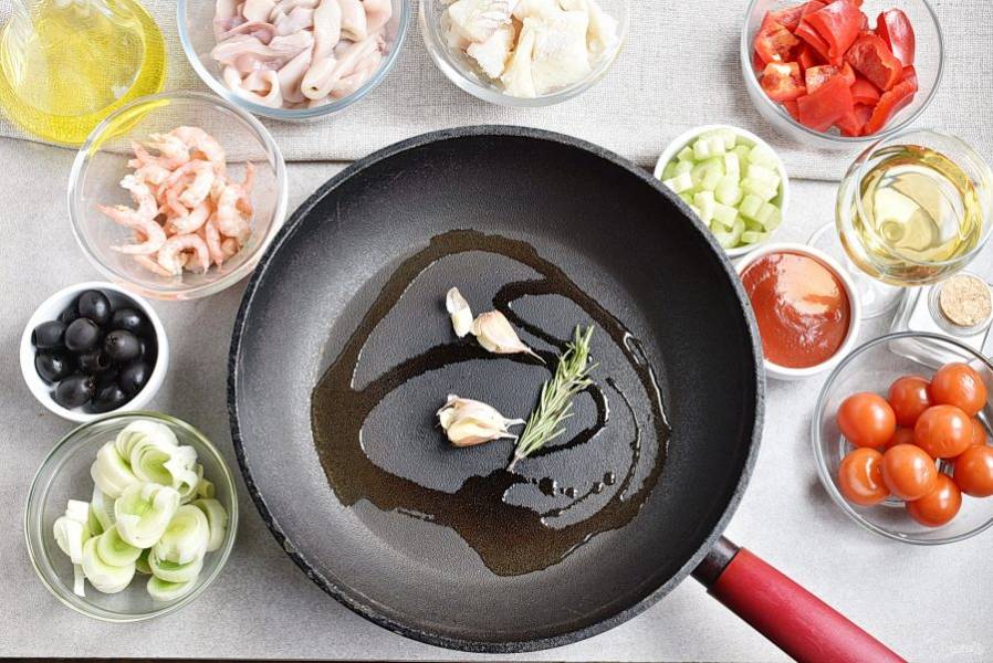 В сковороде с толстым дном разогрейте оливковое масло с веточкой розмарина и придавленным ножом чесноком в шелухе.