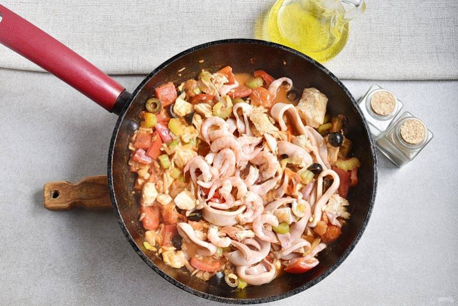 Добавьте кальмары, посолите. Тушите две минуты, помешивая и следя, чтобы кальмары были покрыты соусом.