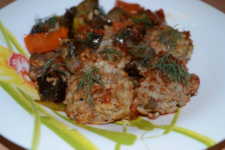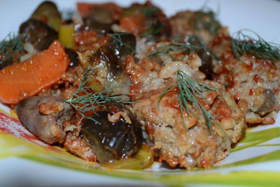 Добавить перец, морковь, баклажан и нарезанный лук к мясу. Посолить. Тушить при закрытой крышке.