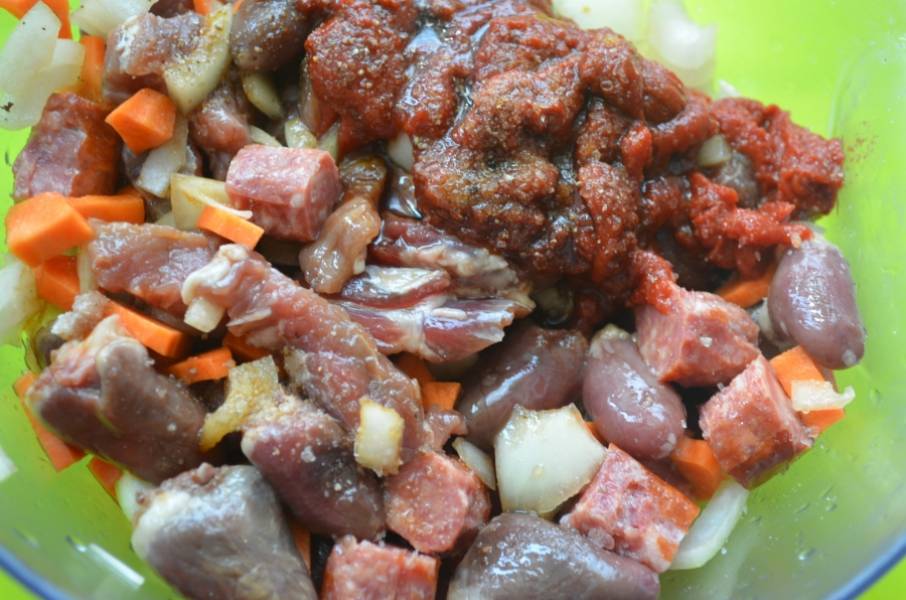 колбаски нарезать небольшими кусочками все ингредиенты смешать,добавить томатную пасту, соевый соус, бальзамический уксус , соль и специи по вкусу. Оставить мариноваться на 20 минут.