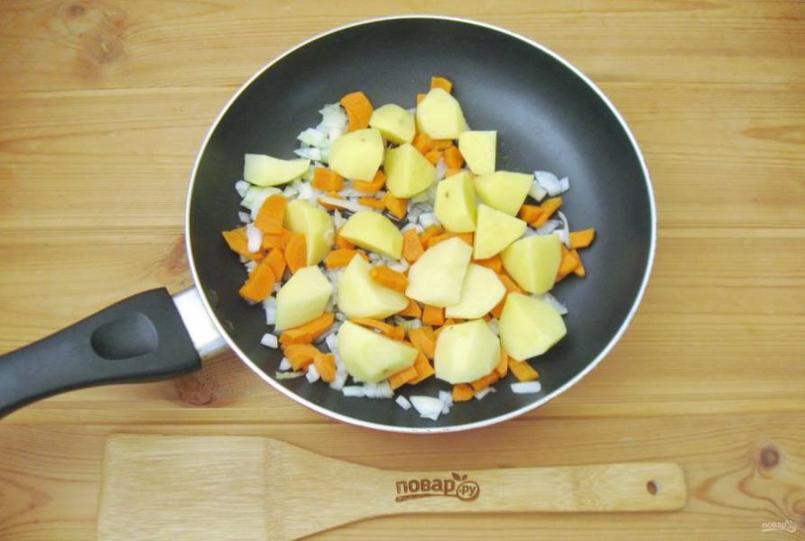 Картофель очистите, помойте и нарежьте кубиками, но не очень мелко. Выложите в сковороду с луком и морковью. Налейте рафинированное подсолнечное масло и 30 мл. воды. Накройте сковороду крышкой и тушите овощи 20 минут, периодически перемешивая.