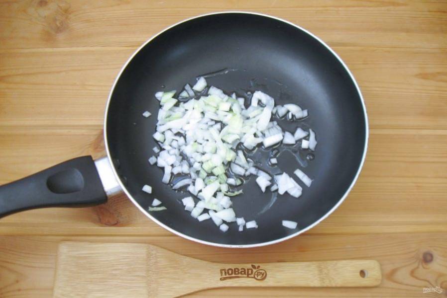Репчатый лук очистите, помойте и мелко нарежьте. Выложите в глубокую сковороду или сотейник.