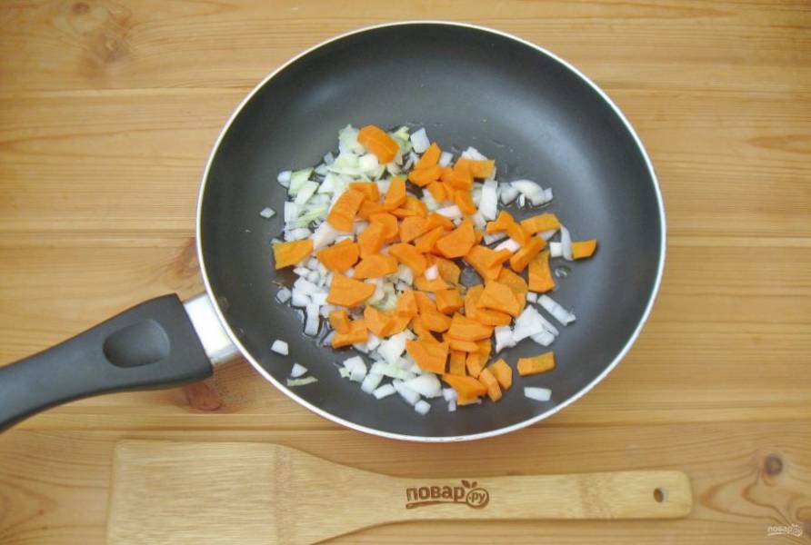 Морковь очистите, помойте и нарежьте. Добавьте к луку.