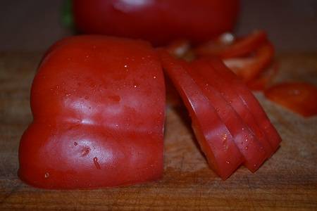 Нарезаем болгарский сладкий перец соломкой и выкладываем в мультиварку.