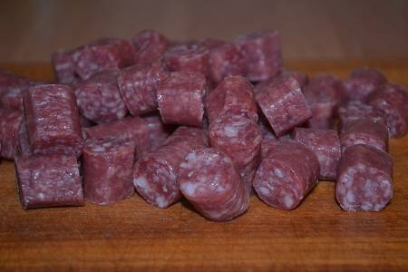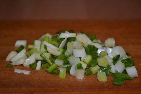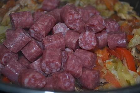 По истечению времени Добавляем и колбасу и зеленый лук в чашу мультиварки.