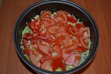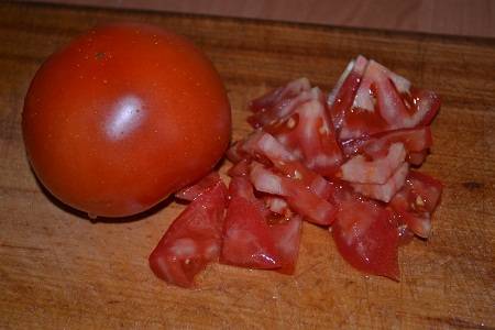 Помидоры обдаем кипятком, предварительно сделав крестовые надрезы, снимем шкуру. Нарезаем помидоры небольшими кубиками.