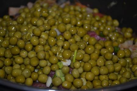 Всыпаем горошек. По вкусу добавляем соль, душистый перец. И включаем на "тушении" еще 10-15 минут.