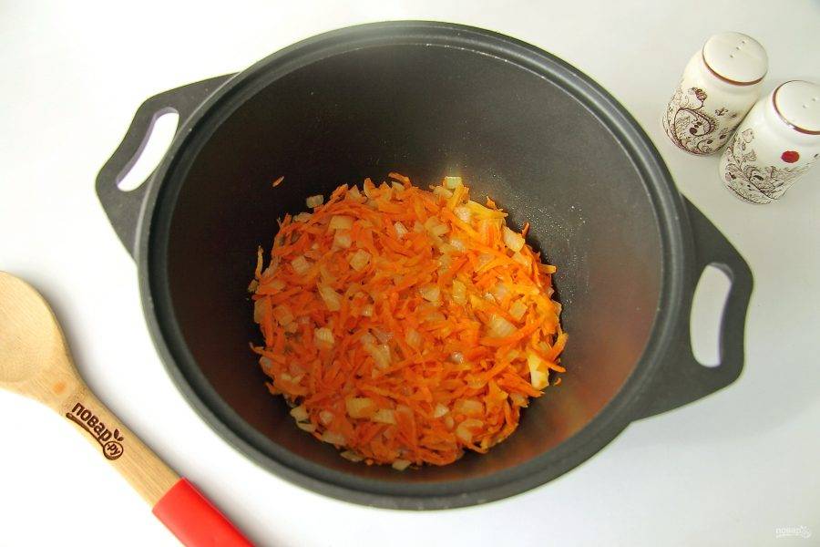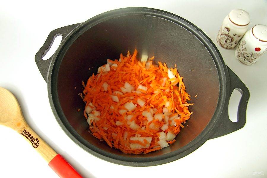 Лук нарежьте кубиками. Морковь натрите на терке.