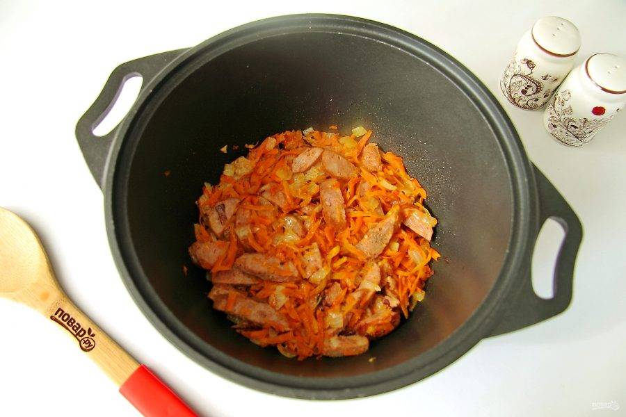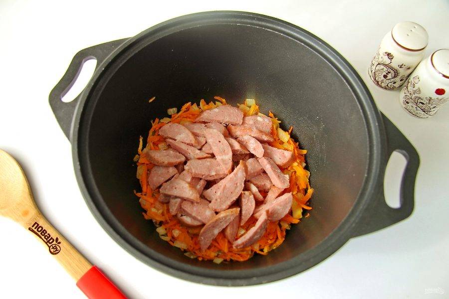 Добавьте нарезанную кружочками или полукружочками колбасу.