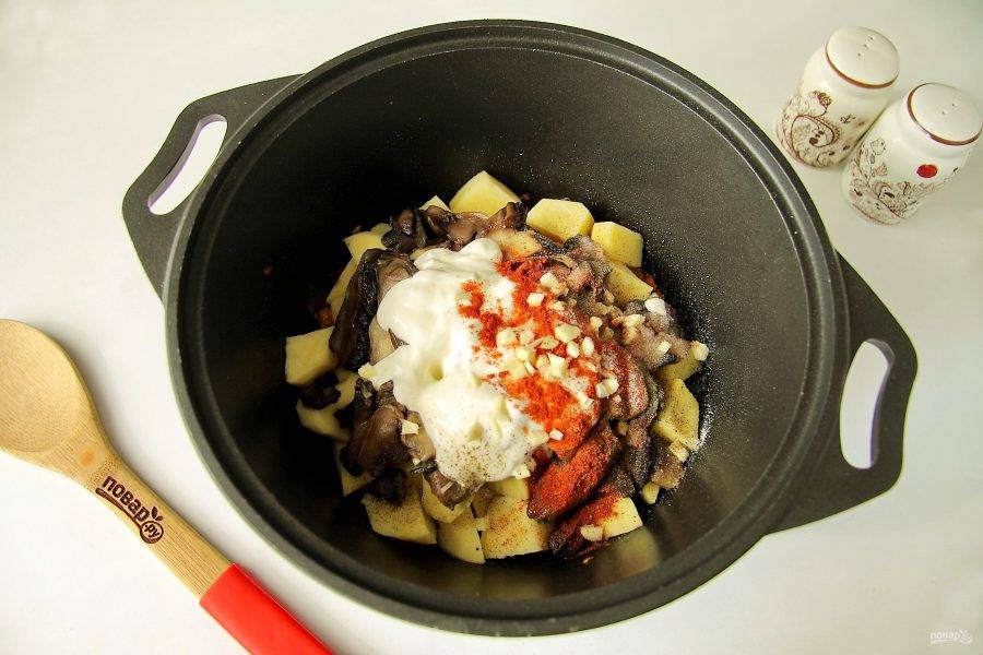 Добавьте сметану, измельченный ножом чеснок, посыпьте все солью и специями.