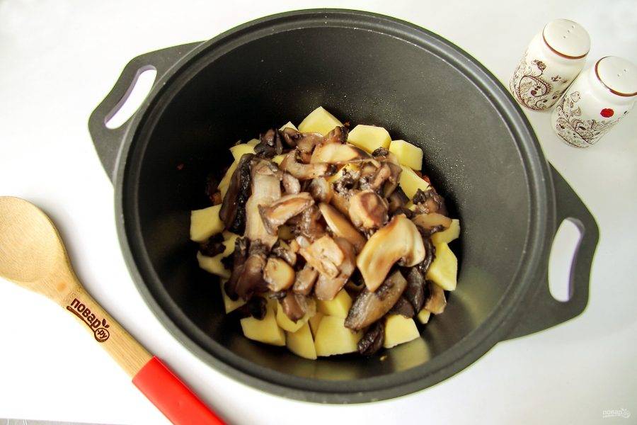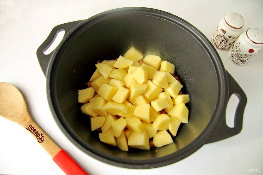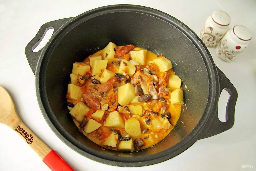 Влейте немного воды и тушите все на небольшом огне до полной готовности картофеля.