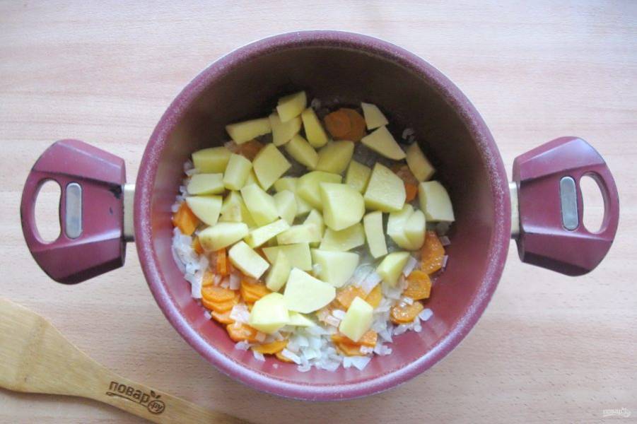 Картофель очистите, помойте и нарежьте не очень крупно. Добавьте в кастрюлю. Налейте 150 мл. воды. Накройте кастрюлю крышкой и тушите картофель с луком и морковью 10- 12 минут.