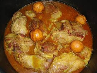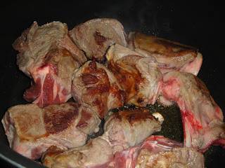 Добавить лук, чеснок. Обжарить. Добавить специи, лаймы, налить воды, чтоб покрыть мясо на 3 см и довести до кипения. На медленном огне тушить 90 минут.