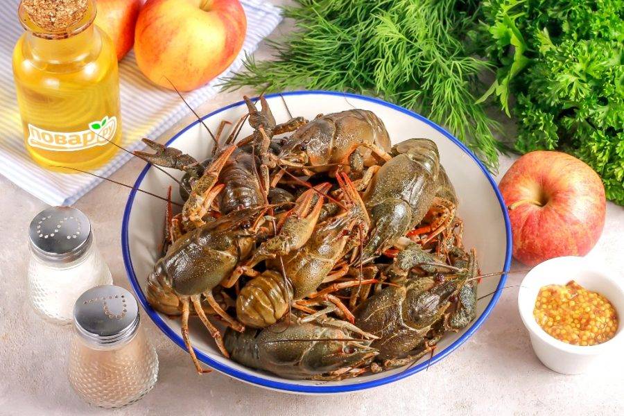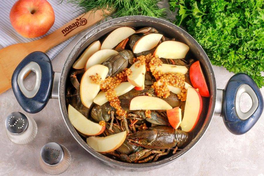 Раков промойте в воде, можно использовать душевую лейку, чтобы смыть с них пыль, песок и водоросли. Выложите раки в кастрюлю или казан с антипригарным дном. Вскипятите воду в чайнике. Яблоки промойте и разрежьте на четвертинки, срежьте семена и нарежьте четвертинки дольками. Добавьте в емкость с раками вместе с зерновой горчицей.