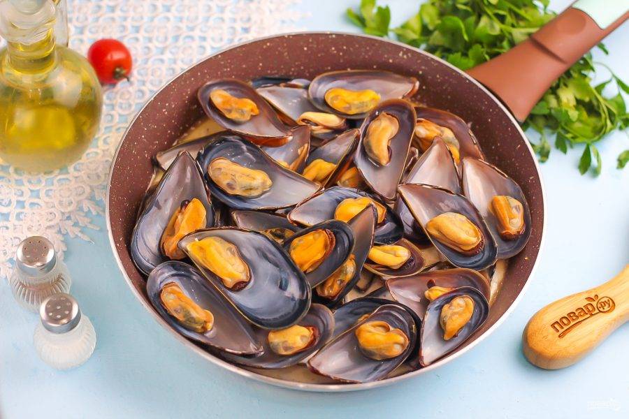 Раскройте раковины и удалите верхнюю часть, оставляя мидии в одной створке. Этого можно и не делать, но таким образом вы удалите лишние раковины. Выложите их в соус.