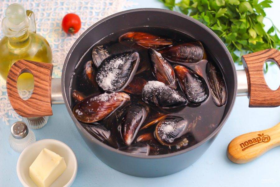 Выложите мидии в кастрюлю или казан, залейте горячей водой, не доливая до края емкости 2 см. Раковины раскроются и появится пена, которая выплеснется за края. Поэтому важно полностью не наполнять кастрюлю водой. Всыпьте соль.