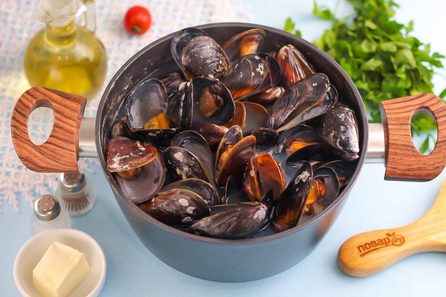 Отварите мидии в течение 3-5 минут. Чем крупнее ракушки, тем дольше времени нужно на их варку. После чего воду слейте и залейте холодную.