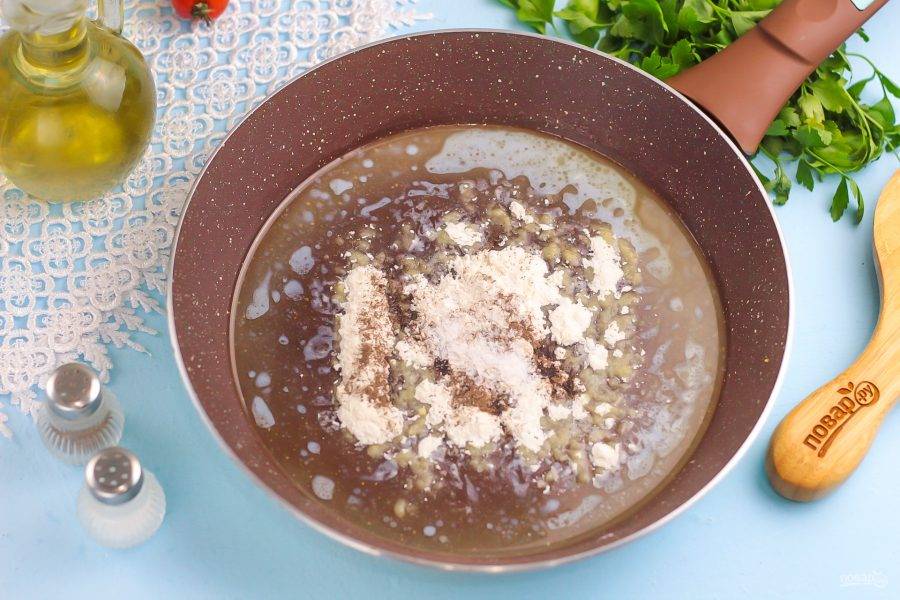 На сковороде или в сотейнике растопите сливочное масло и всыпьте в него пшеничную муку высшего сорта с молотым черным перцем, щепоткой соли.