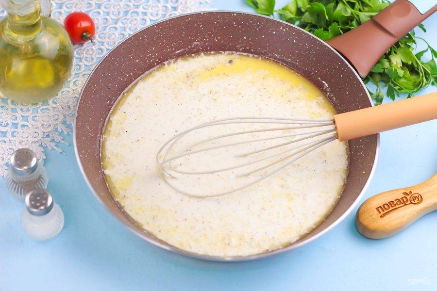 Влейте сливки и тщательно все перемешайте венчиком, не образовывая комочки. Прогрейте соус в течение 1-2 минут. Можно добавить различные специи и пряности по вашему вкусу.