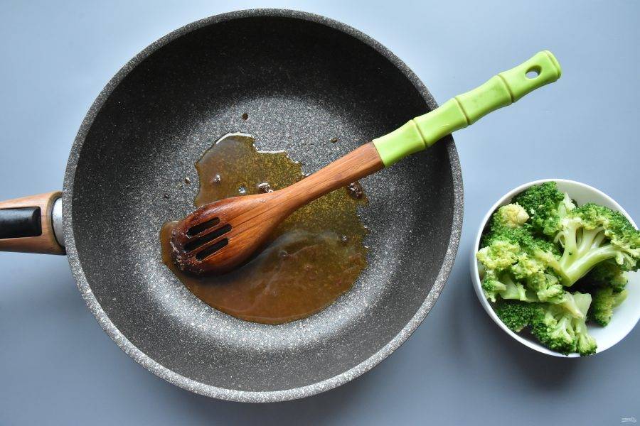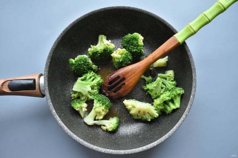 Выложите в сковороду разобранные на соцветия брокколи и готовьте еще 3-4 минуты. По необходимости добавьте еще растительное масло.
