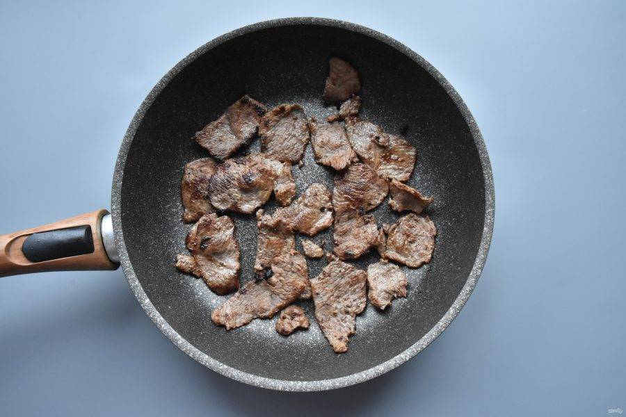 В сковороду влейте растительное масло. Разогрейте его на сильном огне и выложите ломтики говядины в один слой. Поджарьте мясо со всех сторон в течение 3-4 минут. Переложите говядину из сковороды в миску.