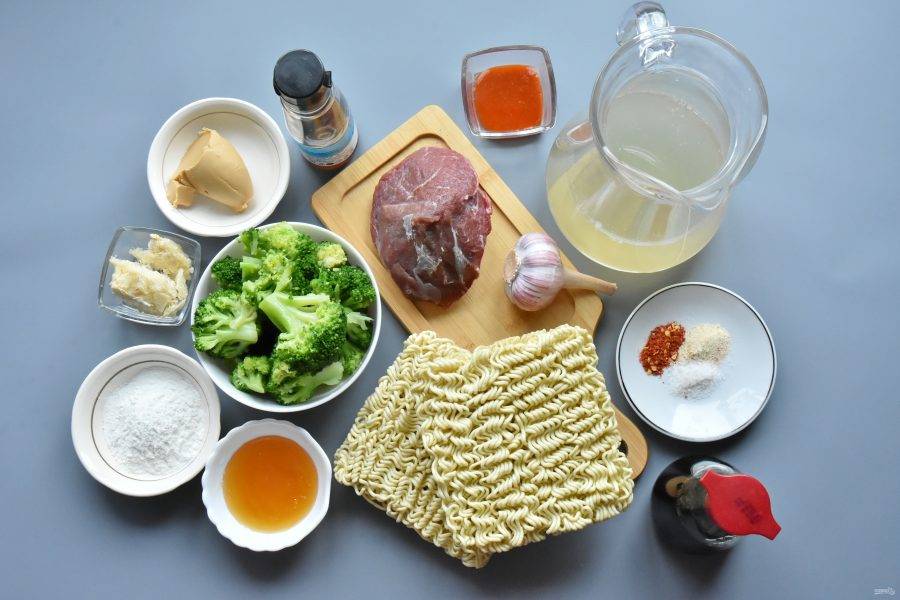 Для приготовления лапши рамен подготовьте продукты. Брокколи можно использовать как свежие, так и замороженные соцветия. Остроту соуса регулируйте по своему вкусу. Если не любите вкус арахисовой пасты, данный ингредиент можете исключить.