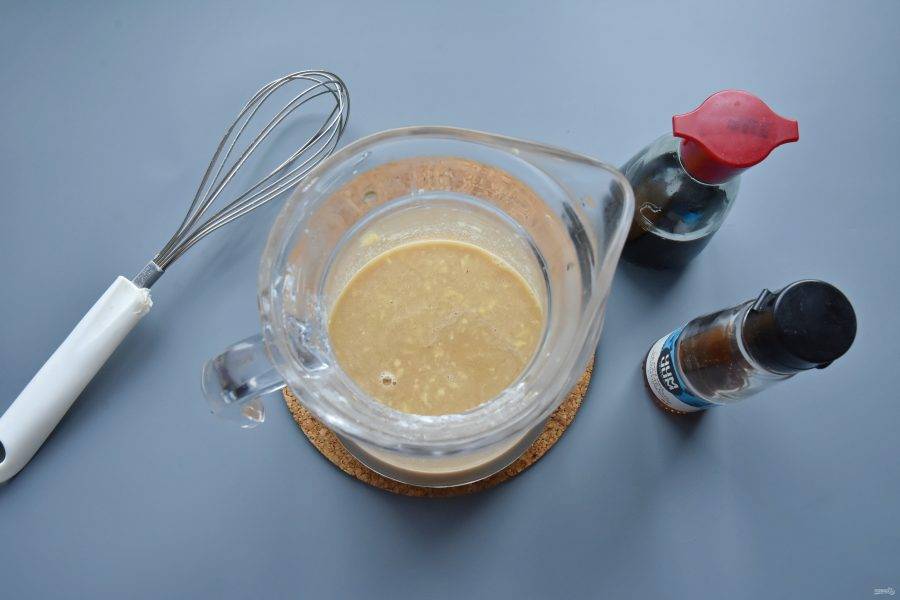 Приготовьте соус-заправку, смешав в кувшине бульон, соевый соус, мед, арахисовую пасту, кукурузный крахмал, кунжутное масло и измельченные имбирь с чесноком.
