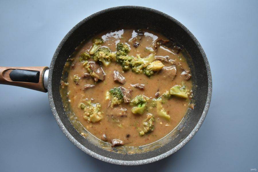 В сковороду выложите ранее поджаренные ломтики говядины и влейте подготовленный соус-заправку. На медленном огне уварите соус до загущения.