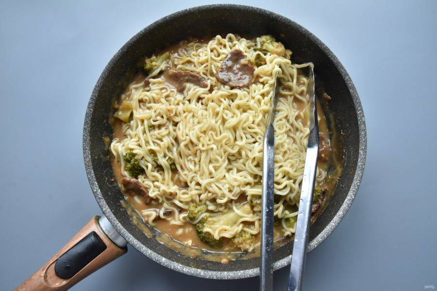 Отварите лапшу, согласно рекомендации на упаковке, желательно слегка ее не доваривать. Готовую лапшу переложите в сковороду с соусом и аккуратно перемешайте, чтобы заправка полностью ее покрыла и пропитала.