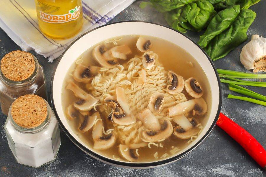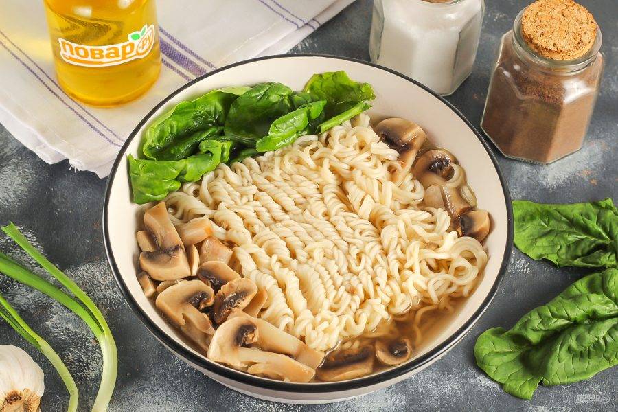Выложите в глубокую емкость лапшу быыстрого приготовления и залейте бульоном с грибами. Если вы будете использовать обычную лапшу, то ее нужно проварить вместе с грибами до готовности. Блюдо с лапшой быстрого приготовления накройте тарелкой и оставьте на 5 минут для набухания.