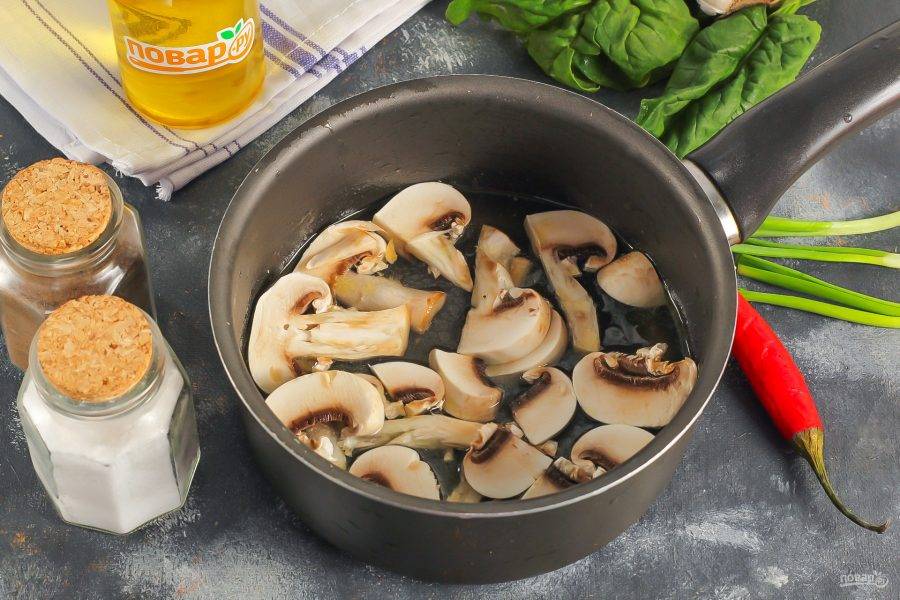Влейте куриный бульон в сотейник или ковш, всыпьте соль и молотый черный перец. Промойте шампиньоны и нарежьте их крупными слайсами. Добавьте в бульон и проварите все примерно 5-8 минут.
