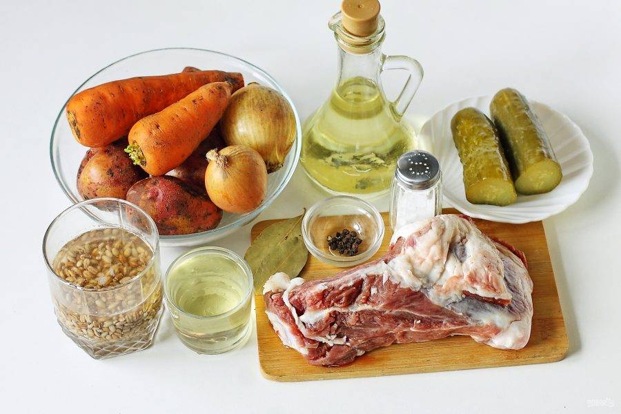 Подготовьте все ингредиенты. Перловую крупу заранее хорошо промойте и замочите в воде на несколько часов. Я оставляю на ночь.