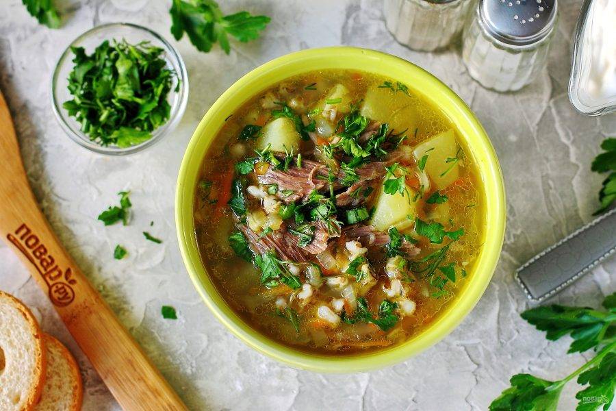 Тем временем крупу промойте, залейте водой и варите на небольшом огне до полной готовности. Это не только поможет сократить время приготовления супа, но и сделает бульон прозрачным, а не мутным, если варить перловку вместе с мясом.