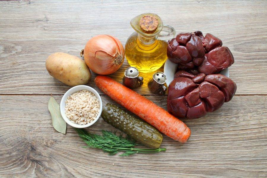 Подготовьте все необходимые ингредиенты для приготовления рассольника с говяжьими почками. Перловку замочите на ночь в теплой воде, чтобы она быстрее сварилась.