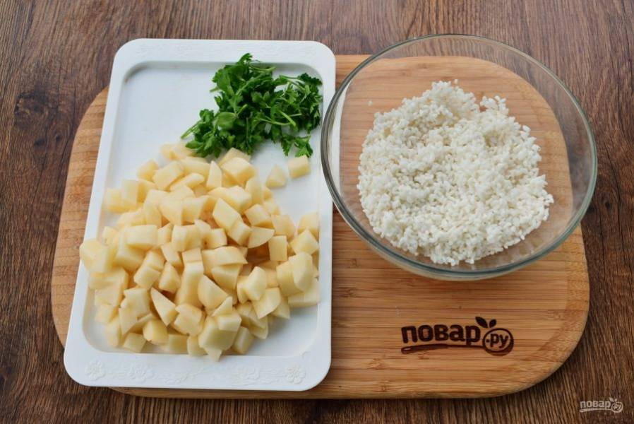 4. Картофель нарежьте кубиками. Рис промойте до прозрачной воды.