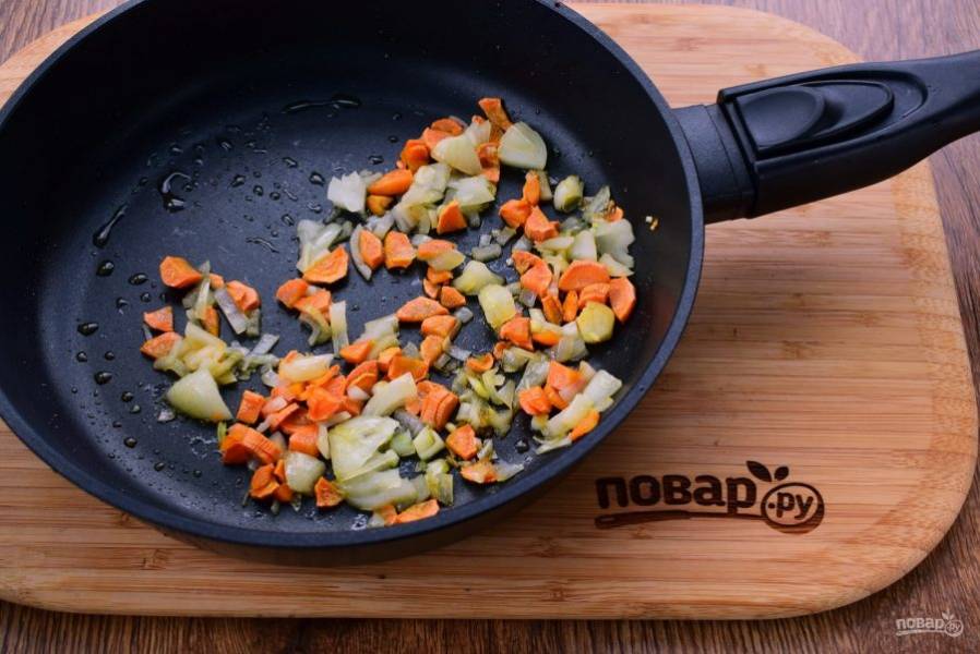 3. Лук, морковь измельчите и обжарьте до золотистой корочки на разогретом растительном масле.