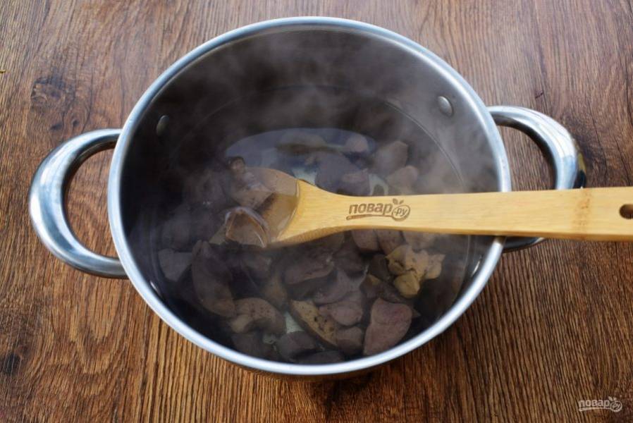 2. Желудки положите в кастрюлю и залейте 1 л холодной воды, доведите до кипения, снимите пену. Варите на небольшом огне до готовности, через 30 минут добавьте сердечки, через 15 минут — печенку. Откиньте на дуршлаг.