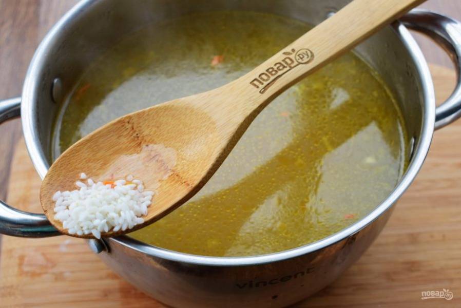 5. В кипящий куриный бульон добавьте рис и картофель, лук и морковь…