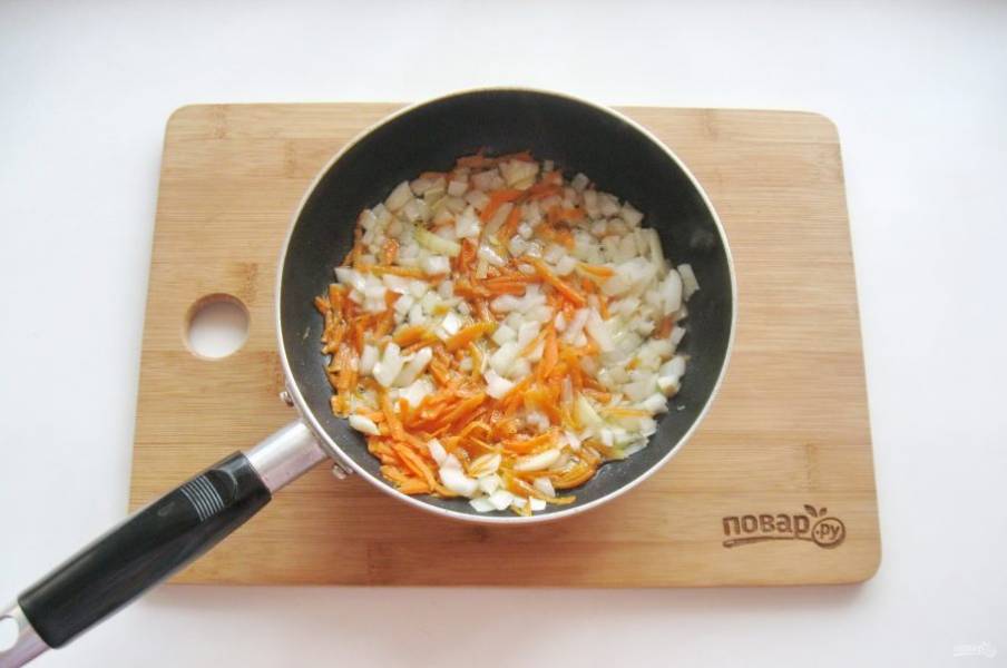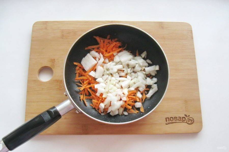 Морковь и лук нарежьте произвольно и выложите в сковороду с рафинированным подсолнечным маслом.
