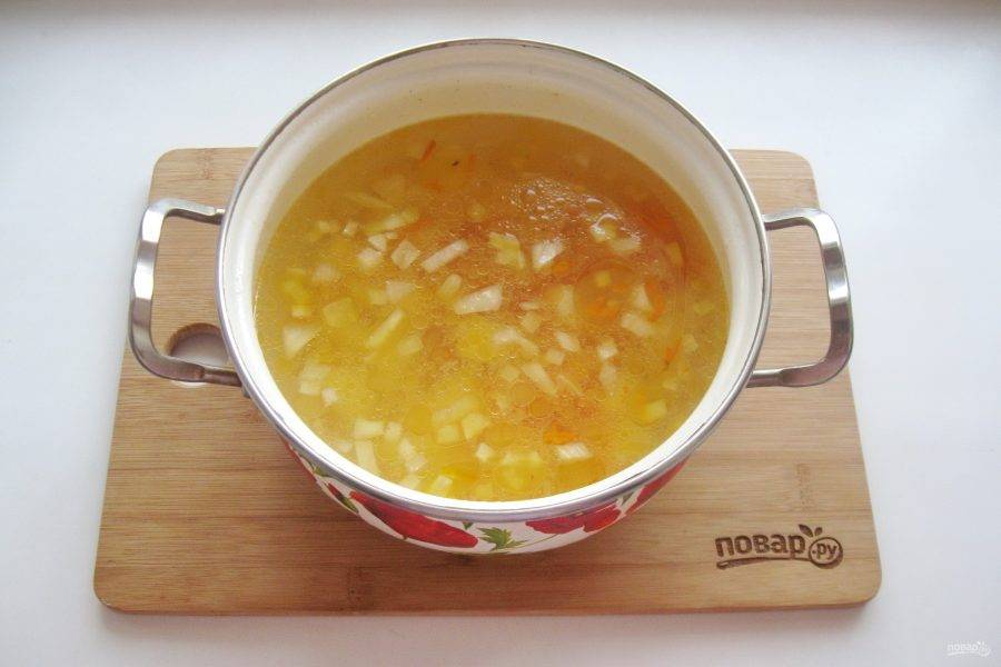 Налейте в кастрюлю бульон, у меня он из индейки. Добавьте нарезанный картофель.