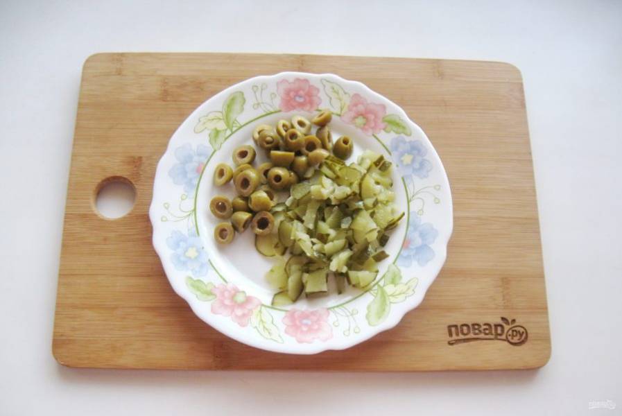 Суп посолите, поперчите. Варите до готовности всех ингредиентов. После выложите соленые огурцы и оливки. Проварите еще 5-6 минут и выключайте.