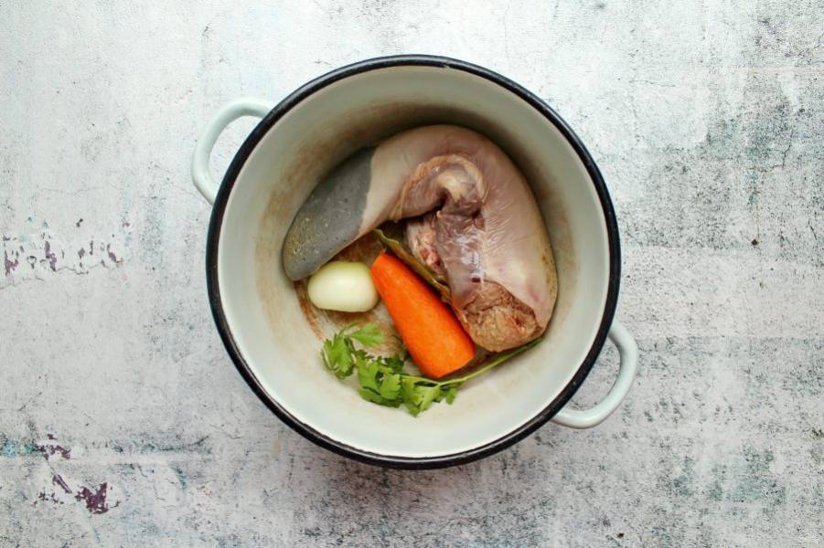 В кастрюлю выложите хорошо промытый говяжий язык и залейте водой, дайте постоять 3 часа. Снова промойте язык, выложите в кастрюлю, добавьте одну порезанную пополам луковицу и морковь. Добавьте немного зелени.