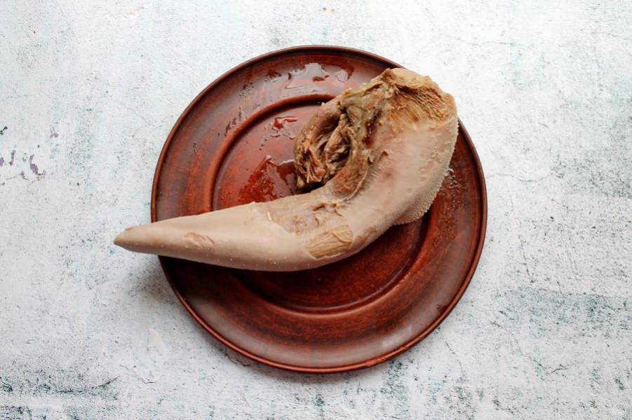 Залейте язык холодной водой и поставьте на средний огонь. Доведите все до кипения, убавьте огонь и варите в течение двух часов, снимая пену. Спустя время достаньте язык из бульона и опустите в холодную воду. Снимите с языка кожу.