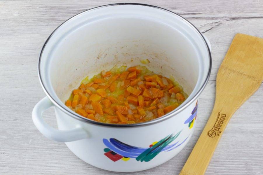 Лук и морковь очистите, помойте и нарежьте небольшими кубиками. В кастрюлю для готовки налейте растительное масло и обжарьте лук с морковью, буквально 3-4 минуты.