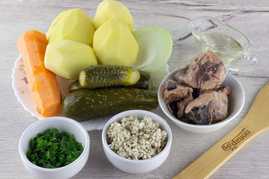 Подготовьте все необходимые ингредиенты. Крупу промойте и залейте крутым кипятком на 10-15 минут, затем воду слейте.