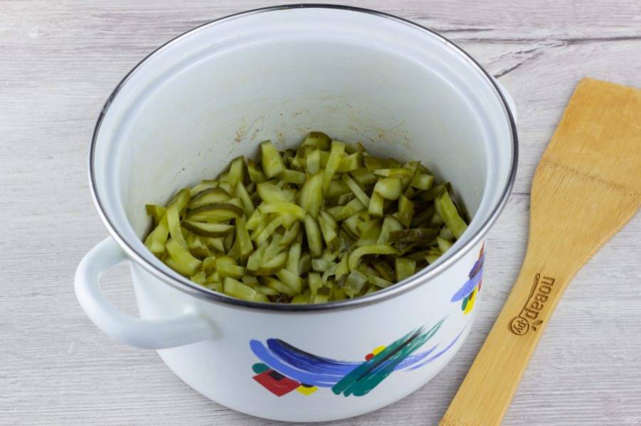 Огурцы нарежьте мелкой соломкой и добавьте к обжарке. Тушите ещё 3-4 минуты.