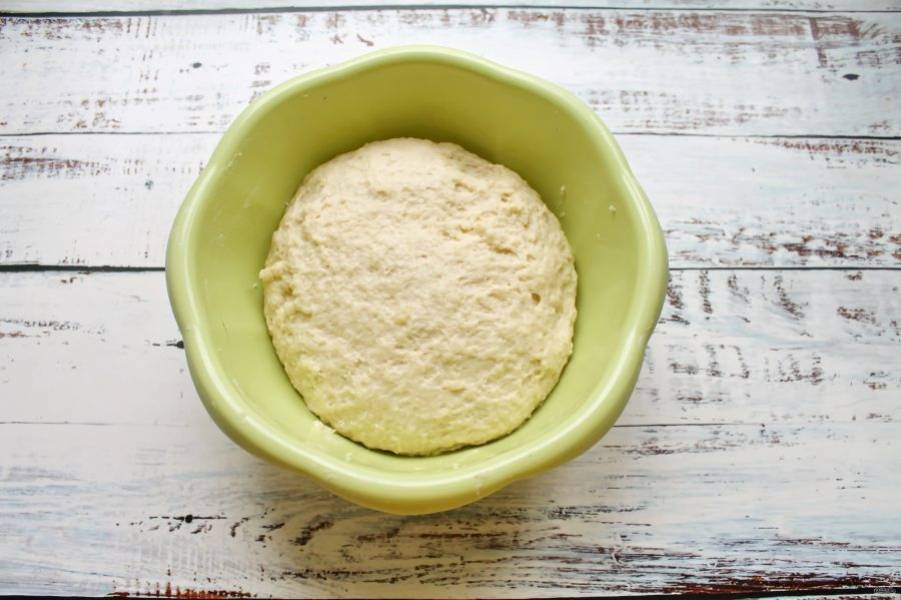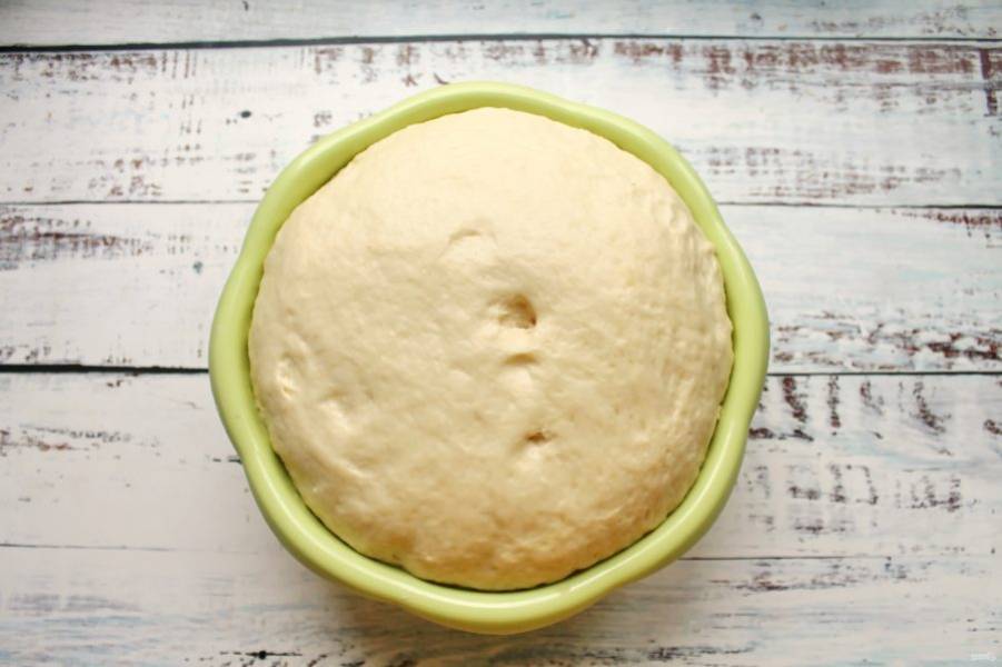 Миску с тестом накройте крышкой и поставьте в теплое место для подъема на 40-60 минут. Тесто должно подняться в два раза.