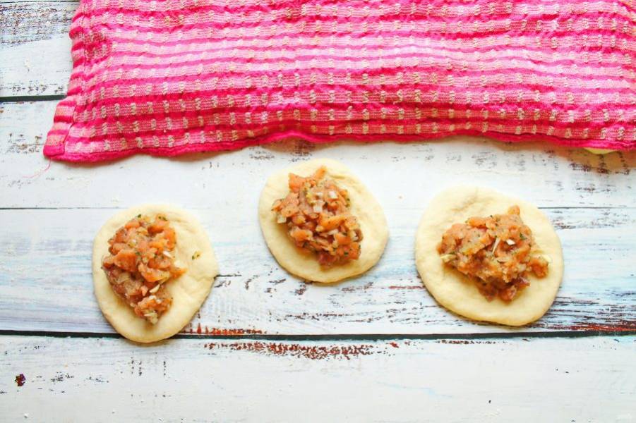Тесто разделите на равные части и скатайте шарики, накройте салфеткой или полотенцем и дайте постоять 10 минут. Каждый шарик раскатайте в лепешку и выложите начинку.